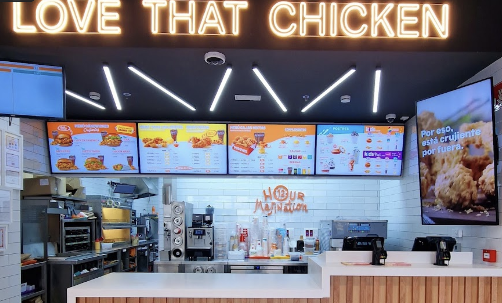 Planteamos un nuevo diseño para las pantallas digitales del interior de los restaurantes Popeyes. Líneas curvas, colores corporativos e iconografía de la marca Popeyes que presentan la información sobre los menús de manera clara e invitan a probarlos.